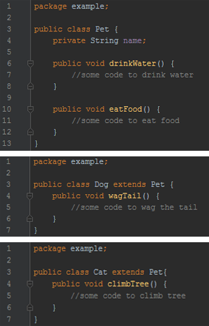 TInheritance allows objects to receive (or inherit) the attributes and behavior of other objects, while still allowing them to define some unique characteristics. For example, cats and dogs are both pets. So, if we were to represent them in Java, we would make a Pet superclass, where we define what the various pets have in common – for example, they all have a name, and they all can drink and eat. We would then have the Cat and Dog subclasses inherit from the Pet class, and would define some unique properties for each – for example, a cat can climb trees and a dog can wag its tail. In Java code, that would look like this: