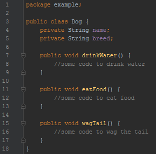 In this example, “Dog” is the name of the class, while “name” and “breed” are the attributes (what is known about the dog), and “drinkWater”, “eatFood”, and “wagTail” are the operations (what a dog can do; in Java these are called methods).