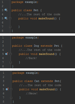 Polymorphism allows for the definition of some sort of action with potentially many ways to perform that action. For example, we all know that dogs bark and cats meow. However, if we decide to implement a bark() method in the Dog class and a meow() method in the Cat class, the program would always have to check which type of pet it is dealing with in order to make a sound. Polymorphism allows us to define a makeSound() method in the Pet superclass, and define different behavior in the subclasses.